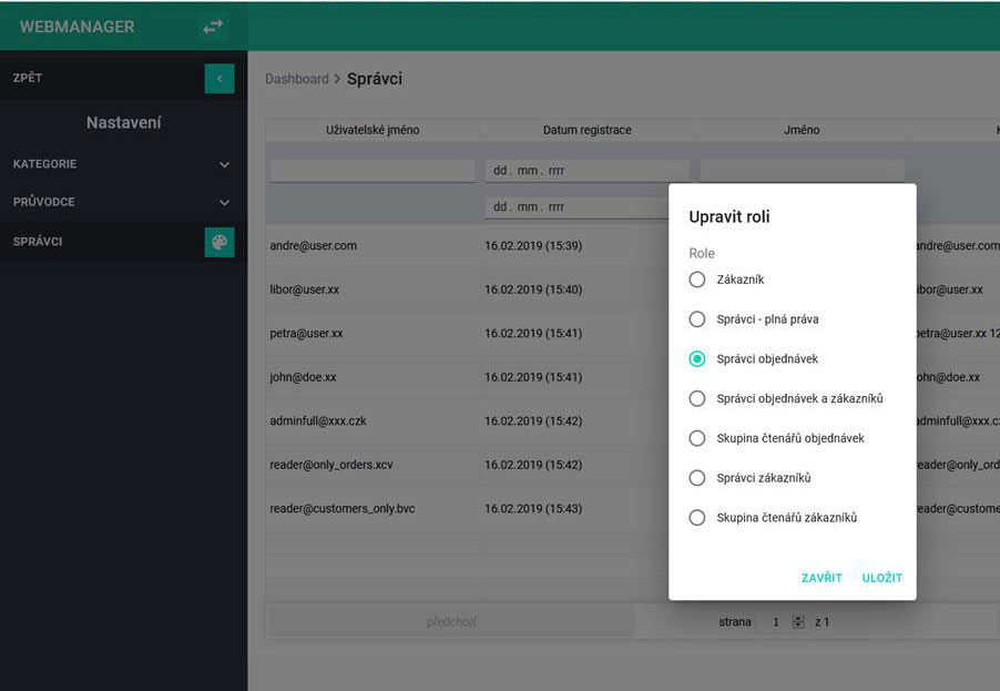 Od 20. 3. 2019 je k dispozici rozšíření webového managera o správu rolí. Tato funkčnost vám umožní nastavit pro
