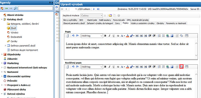 Přihlásíte se do administrace svého e-shopu pomocí Zoner inShop Managera a natáhnete si aktuální data ze serveru inShopu. Poté již půjdete na editaci konkrétního výrobku. Záložka - Popisy - pole Rozšířený popis a zde použijete ikonku - přepnout do textového módu, viz. obrázek níže:
