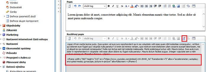 Vrátíme se zpět do administrace e-shopu a vložíme zdrojový kód do popisu výrobku, viz. obrázek níže. Po vložení pak přepneme zpět do grafického módu. Video se již zobrazí pod textem a máte možnost přidat např. nadpis nebo jej umístit do středu stránky apod.
