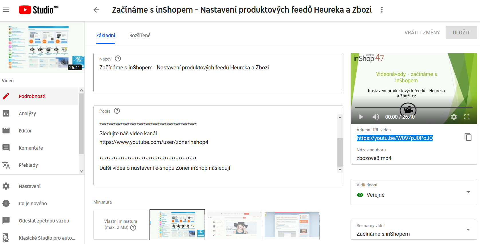 Ukázka administrace videa na YouTube