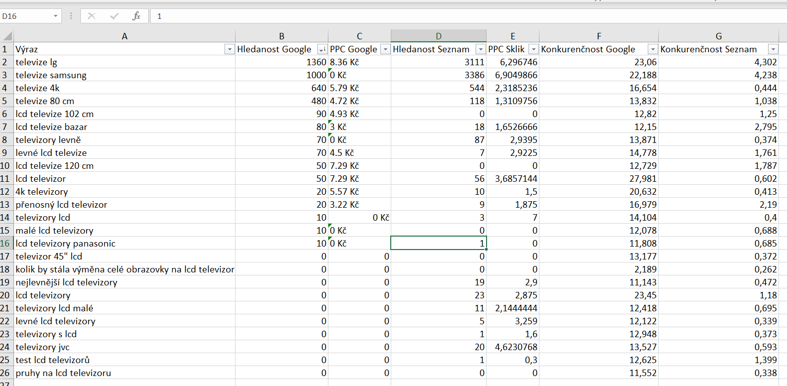 Podle hledanosti a konkurenčnosti si stanovíte hlavní výrazy i skupiny dalších méně důležitých výrazů. Jako praktický příklad použijeme výsledky vyhledávání výrazů, které souvisí s LCD televizory.