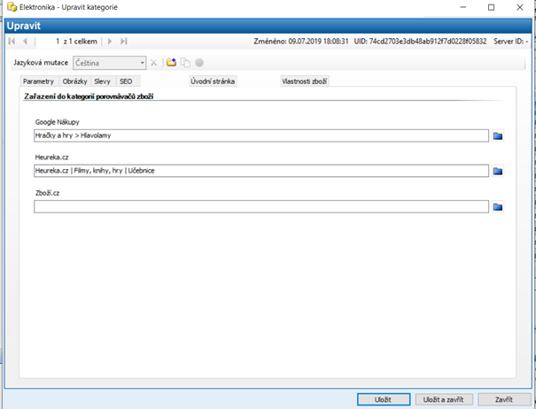 V rámci nastavení kategorie je k dispozici záložka – Porovnávače a v ní máte možnost vybrat si z otevíracího seznamu vhodnou kategorii pro Zbozi.cz, Heureka.cz a Google Nákupy.