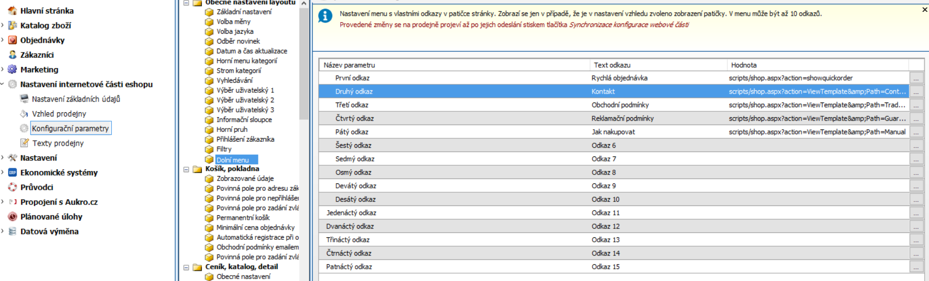 Nastavení internetové části obchodu – Konfigurační parametry – Dolní Menu.