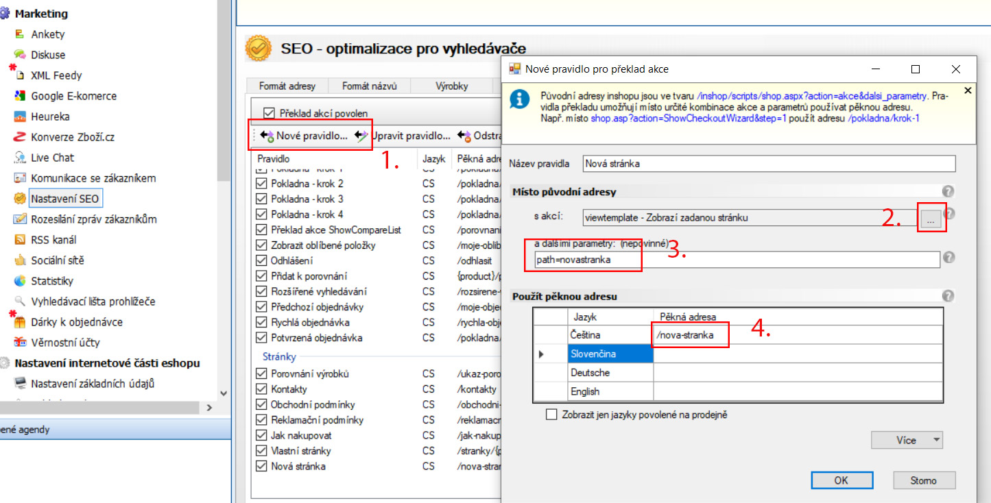 Marketing – Nastavení SEO – Záložka Akce/Stránky.